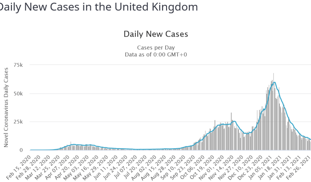 In the UK, cases fell from 60K per day to 9k per day, an 85% drop and have not flattened yet (maybe because they didn’t have a Texas-like disaster or a President’s Day Holiday in February).