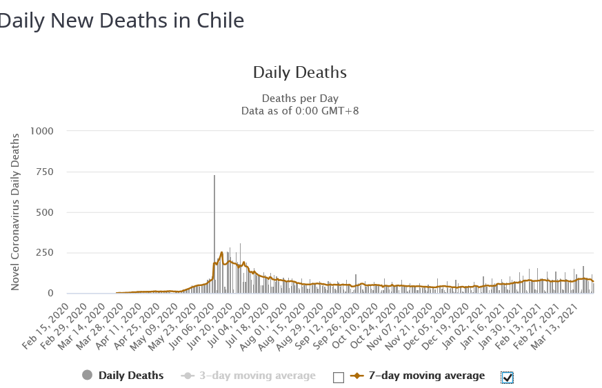 Note: it is hard to discern the drop in deaths in Chile from the graph, but the most recent peak in deaths was on March 19 at 91 per day. A week later, on March 26, deaths are at 72 per day.