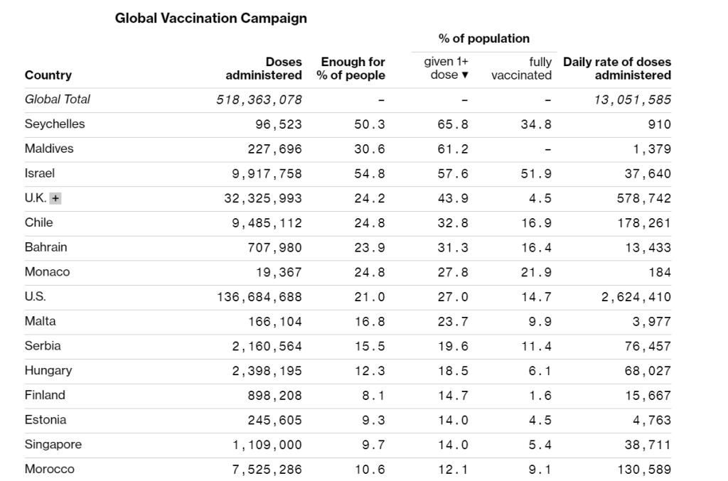 The U.S. vaccination rate of 2.6 million per day is among the best in the world. Unfortunately, most countries are lagging behind in the rollout, so cases and deaths are rising significantly in many countries; France, Brazil, and India among others are seeing a significant resurgence right now. The vaccination leaders as of March 26 are listed below (per Bloomberg: More Than 518 Million Shots Given: Covid-19 Vaccine Tracker (bloomberg.com):