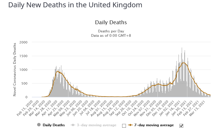 Deaths peaked at 2256 per day last April (first wave), then fell to a low of 520 and then went back up to 1090 over the summer (second wave) and then dropped a little and then up a lot, spiking to 3473 in late January (third wave). As of March 26, deaths are at 985 per day, down about 10% in the last week and down 70% from its peak January 26.