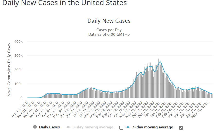 Vaccines are still being rolled out at a rate of 1.8 million per day in the U.S. This is a good number despite being much lower than the rate a month ago. The pool of unvaccinated is always shrinking, so expect the rate to continue to fall throughout the rest of Spring and Summer. As of Friday, May 21, 48.2% of Americans have received at least one dose. We should hit 50% with one dose by the end of May and so by the end of June, we should have at least 50% fully vaccinated. This will continue to put downward pressure on COVID cases and deaths.