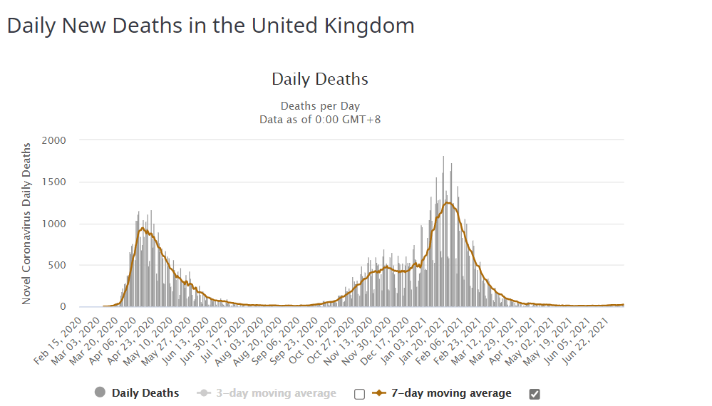 I must admit I am astonished by this sudden increase. As you can clearly see, cases are now higher in the UK than they were last November when they peaked around 25,000 per day. This new development looks really bad. After more than a year of fighting COVID and finally finding a cure, we are going back to where we started.