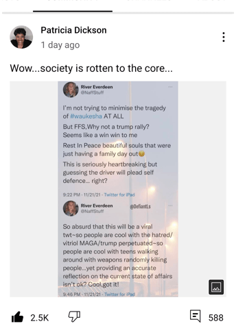 Nevertheless, ordinary folks are influenced by the racial narrative. The media wants to attack their opponents for their own political advantage, but then they ignore the fact that they are influencing people in a very negative way, a way that is dividing our citizens and damaging the fabric of our country. You want to know why we are divided nation and why we have so many people like the one below who laments the fact that this individual didn’t drive his SUV into a Trump rally instead? It is because of people like Sharpton, Reid, Biden, Binger (the Rittenhouse prosecuting attorney), and others who lie about events like the Rittenhouse trial in order to sell their own racial narratives or advance their own political interests. These folks are the real problem.