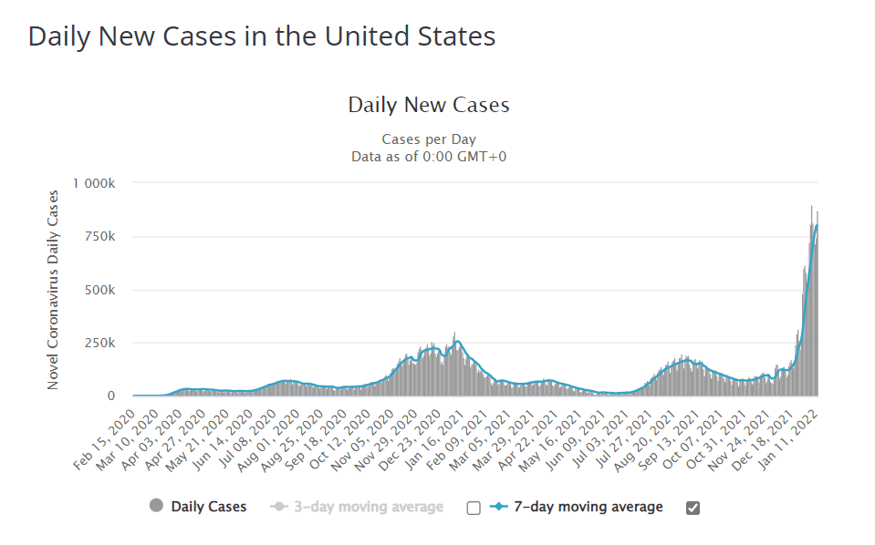 COVID cases in the U.S. may have peaked at around 800K per day, the average inching past that level on Thursday, January 13. This current level is more than three times the previous record (before this month, the U.S. peaked at 256K in January 2021). I think we won’t go much higher as we are now increasing at a much slower pace than during the last couple weeks. Depending on your political orientation this is either a very good thing (because it could mean the end of the virus altogether) or a reason to implement even more control than before (so others can claim to have ended it for us).
