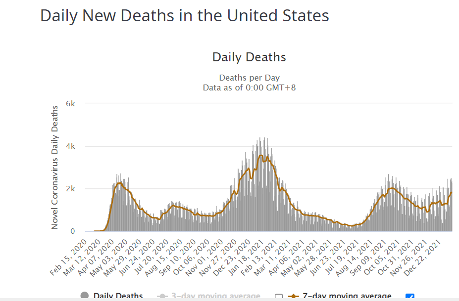 You would expect a much worse situation with everyone in the world getting sick or about to get sick in the next few weeks. Maybe the U.S. gets to 2,000 deaths per day (or maybe not). The relevant factor is that Omicron! is not the same beast as Delta. Furthermore, Omicron! is already beginning to commence to start to burn itself out. With U.S. cases falling through the last half of January, deaths will peak soon, probably in late January and then also fall rapidly the rest of the Winter. We are near the absolute worst of Omicron! and are about to head down a steep slide into an endemic COVID state. Will there be another variant to end all variants or will Omicron! be last gasp until the distant future? Nobody knows for sure, but Omicron! is as good an omen as we have had the last two years. Will there be some long-term consequences and residual effects from two-years of COVID? No doubt there will be, but we have opportunity and time to prepare and deal with that now.