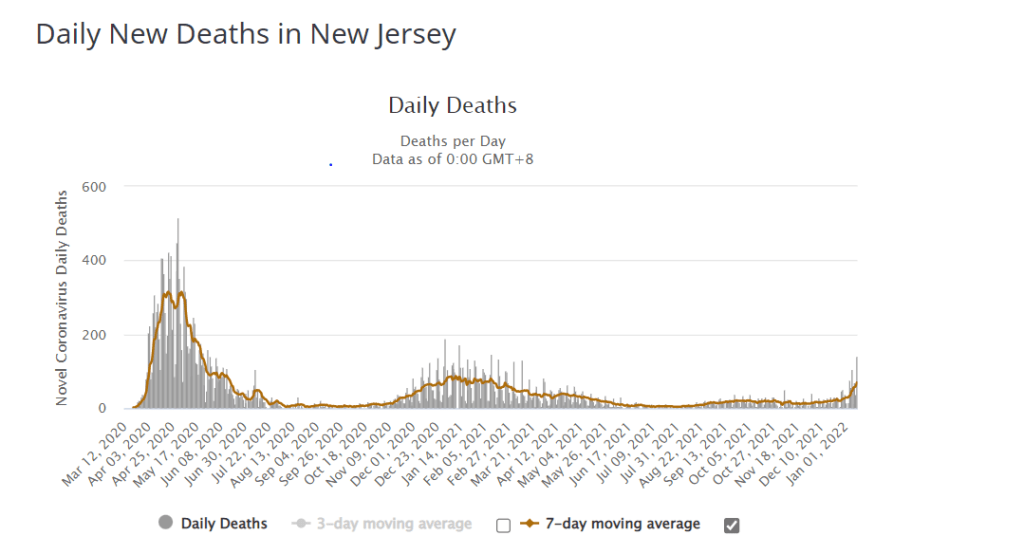COVID deaths in the U.S. are still rising as well, although they fell Thursday (we are at 1,874 per day as of Friday, January 14). Deaths currently are still half of what they were this time last year and I doubt they go much higher than they are now. Deaths in New Jersey are currently at 84 per day and may go up to 100 per day, but this number would still be well below where they were in the earlier waves (as evidenced in the graph below). Let’s give thanks for how this is going at the moment.