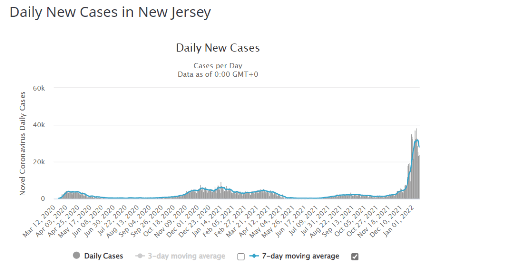 Because it is so contagious, it doesn’t take long for the Omicron! story to unfold. Cases increase very rapidly as Omicron! infects nearly everyone who is still alive, even those locked down, double-masked, triple-vaxed, and otherwise avoiding all possible trouble. But, in short order (usually about a month), there are fewer and fewer remaining subjects to infect, and cases then decline rapidly. We will be beyond this Omicron! crisis before you know it. Just hang on a bit longer, please. We may already be at the peak or we will be by the end of this week. Some states in the U.S. already appear to have falling case numbers. New Jersey, for instance, is one state that appears to be at or near peak with cases falling the last three days (we see similar results in other states as well):