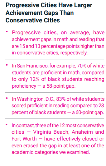 The following study reveals there are larger gaps between whites and minorities in “progressive” cities than in conservative ones. The progressive solutions which argue for less stringent standards have not done as well. Conservative solutions, those from the so-called racist folks, generally demand better from kids, and are actually doing better to close the gaps between races. Go figure.