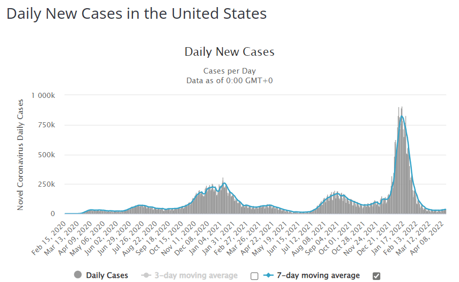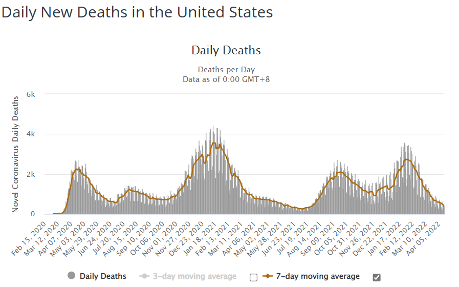 As of Friday, April 15, U.S. COVID deaths have fallen to 370 per day. Expect a slight increase in last week’s tally as more deaths are confirmed over the next week, but we will still be well below 400 per day for a while.