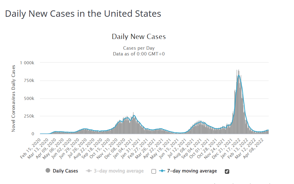 - 7-day moving average of COVID cases per day April 28, 2022: 53,000