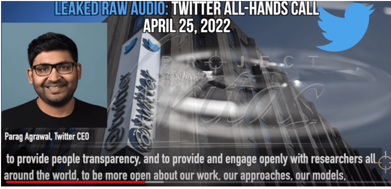 Around 21 minutes, CEO Agrawal says “we all understand what free speech means”. But he pretends free speech is something most of us do not recognize.