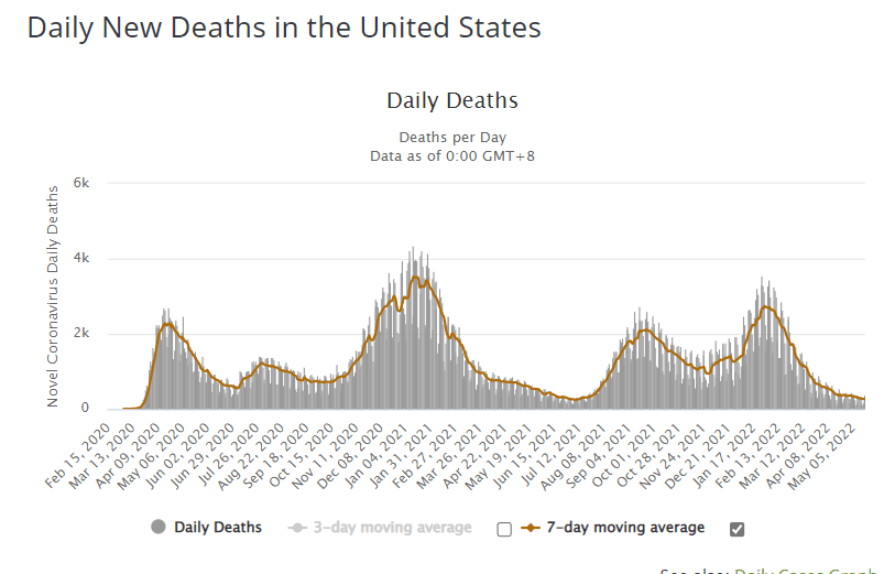 Deaths peaked at nearly 3,500 per day in January 2021. February 1, 2022 they were back to 2,700 per day. By April 16, they fell below 400 per day. May 11, they fell below 300 per day. As of Saturday, May 14, average daily deaths stood at 280 per day.