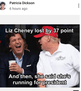 Despite recognizing Trump’s flaws, we don’t jump on the Democrat’s J6 bandwagon or follow their outlandish theories regarding the 2016 election as Representative Cheney does. We’re not looking for the plaudits and new found respect from the opposition as she is.