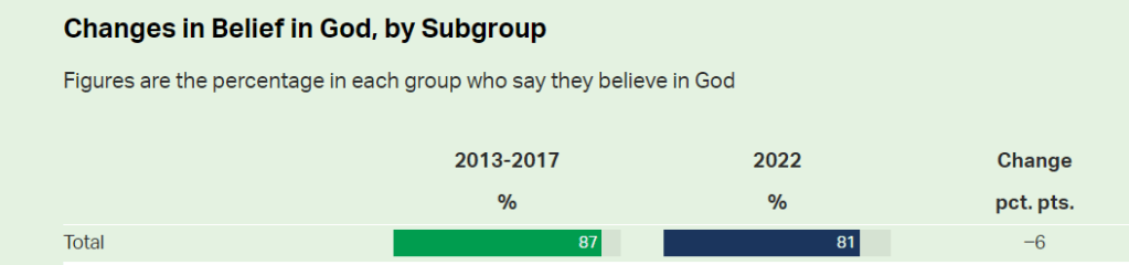 The overall drop of belief in God from 98% to 81%, is significant. Believing in God, no matter your religion, used to be a commonality that united the country. The big gap between Liberals and Conservatives (94% vs 62%) also stands out.