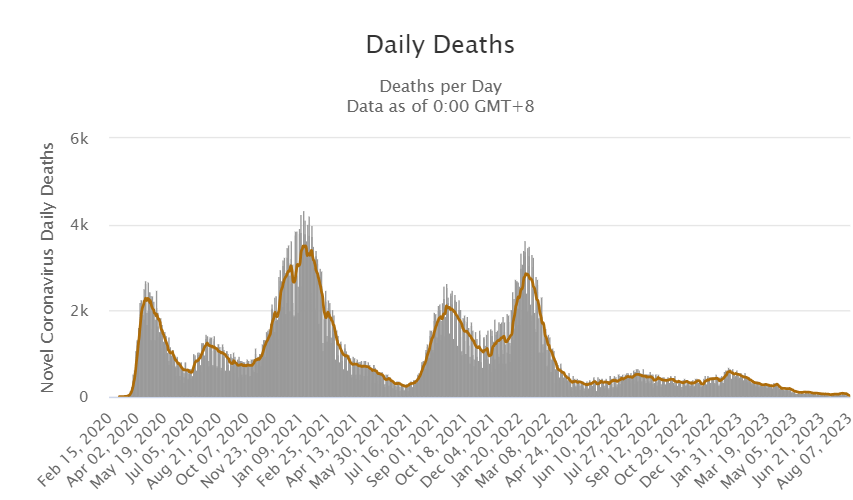 COVID has not been a significant public health issue for eighteen months. The increase this Summer is minor, the average having crept back to 109 deaths per day as of August 2. We need to put this increase into the proper perspective.