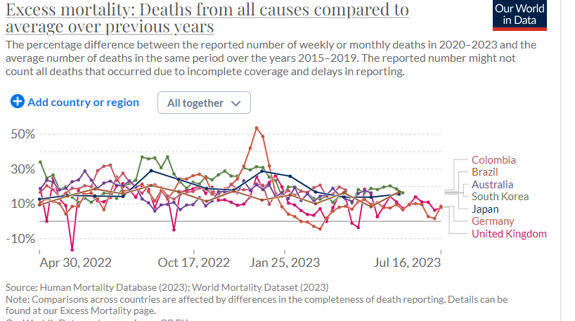 Two months ago in a COVID retrospective, I noted despite this marked decline in COVID deaths in 2022 and 2023, deaths were higher than expected everywhere around the world: