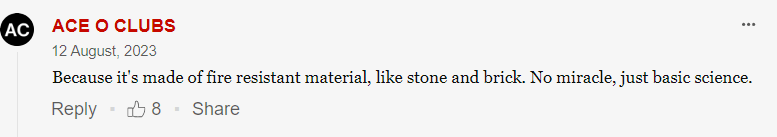 Are we to believe only flesh and wooden structures burn in such events? The church’s roof and windows are not made of stone, yet they are undamaged. The fire’s heat could surely melt glass. The church survived because it wasn’t even exposed to the fire, not because it resisted the fire. Perhaps the church was somewhat prepared for this event, but nature has a knack for destroying the best laid plans of mice and men.