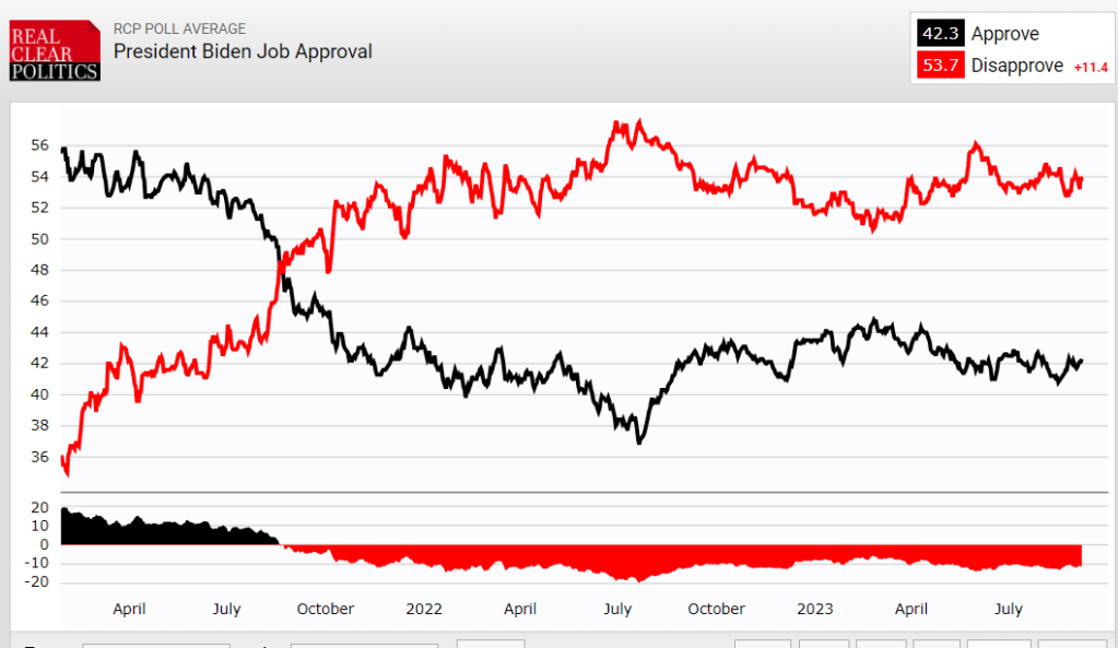 Yet, the administration still pushed for mandatory vaccinations in September 2021. Was it because more vaccines would make an actual difference or because of falling poll numbers? President Biden remained relatively popular during the first six months of his administration, but after the withdrawal from Afghanistan in July 2021 his poll numbers dropped precipitously. They have not recovered in the two years since.