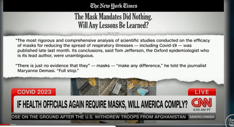 The New York Times has challenged masking as well. All of one-channel liberal media lined up squarely behind masks for three years. Now they are coming around to our point of view?