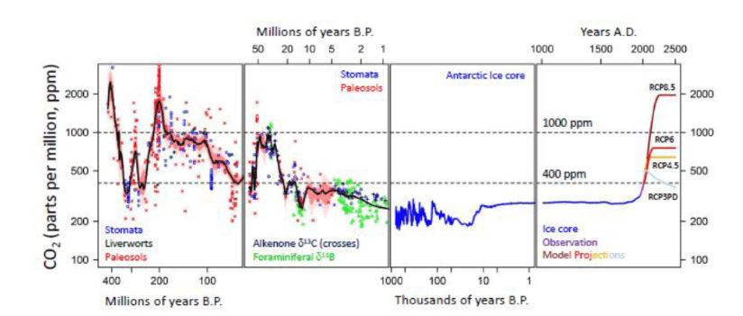 The graph below shows CO2 levels have been significantly higher in the past and the earth’s climate did not careen out of control during those eras. On the other hand, the change in the last two-hundred years has been significant. The projections for the next few centuries are also shown below. Are those projections accurate, and if they are, what does the sudden rise mean for us? Is a massive C02 increase inevitable, and if it actually happens, is it truly the end-of-the-world?