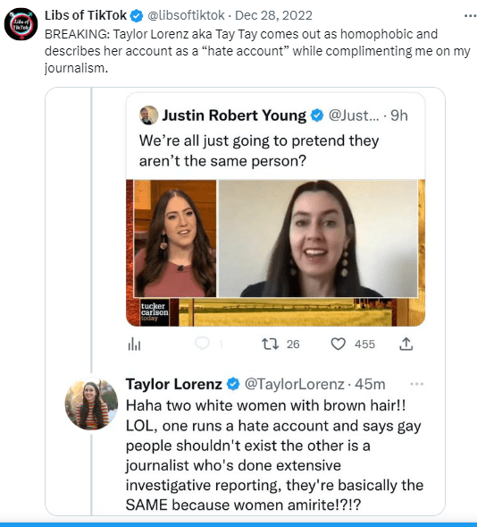 Lorenz simply does not bring the receipts for the charges see makes (see panel above), but please watch the interaction for yourself and form your own opinion. Is Lorenz correct? Does Raichik “run a hate account” and believe that “gay people should not exist” or is Raichik’s argument not so simple and not so intolerant as Lorenz portrays?