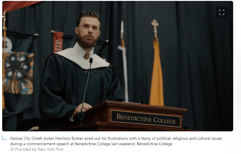 Kansas City Chief placekicker, Harrison Butker, raised himself from relative anonymity with a commencement speech at Benedictine College (Atchison, Kansas) last week. He spoke of Catholicism, of Catholic and traditional values to Catholic kids at a Catholic college. He spoke of “controversial” things like the importance of family, the domestic church, and our distinct roles within the family. The reaction from one-channel media, the NFL, and public figures–the elite who believe they control the narrative–has been overwhelmingly negative. Of course, Mr. Butker probably thought this speech would not travel beyond Atchison. Without seemingly trying, he put the elite in their place. How dare he?