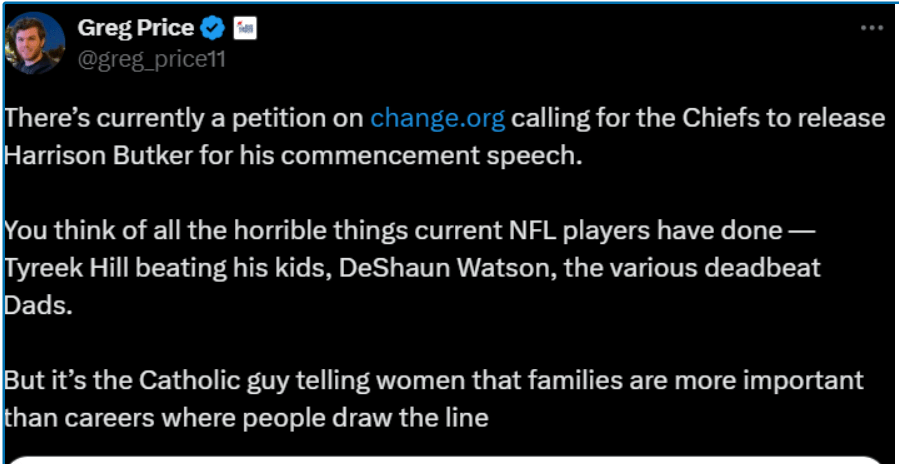 Mr. Butker spoke to Catholics regarding Catholic principles. He is supposed to be inclusive of the pro-choice crowd and other critics? I think not.