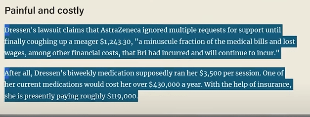 This woman’s current treatment is $3500 every two weeks (for life), not including hospitalization and countless doctor bills, yet AstraZeneca offered her a pittance for her trouble.