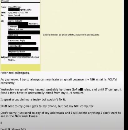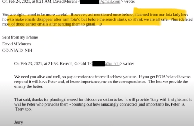 We learned more shocking details during Congressional testimony in May 2024. Dr. David Morens, a senior advisor in NIH and colleague of Dr. Fauci, spoke of making emails disappear: