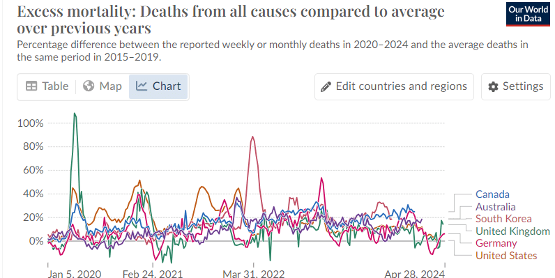 Excess deaths around the world (deaths beyond the normal expected value) understandably spiked in 2020 with COVID. Yet, as COVID diminished and vaccines ramped up excess deaths remained high. We reverted back to the mean only in 2024 (when few are getting the vaccine).