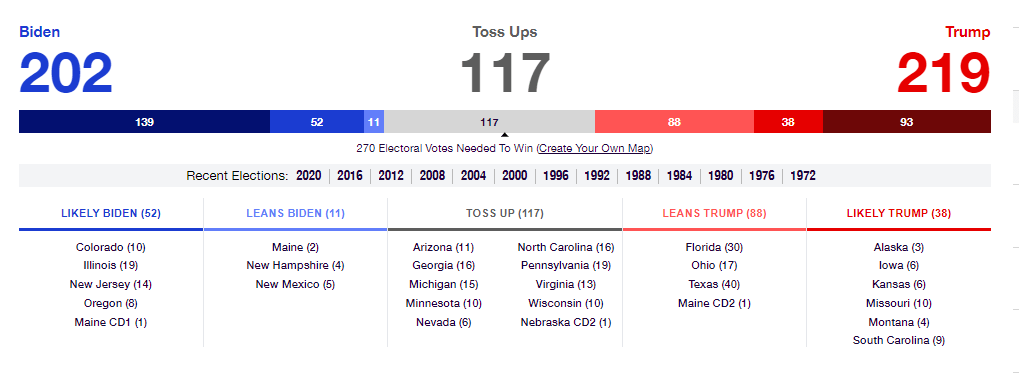 Like many recent elections, the vote in many states seems a foregone conclusion. At the moment, RealClearPolitics has only nine states (and one congressional district) as “Toss Ups”. These states and maybe a few others will likely decide the election. Trump is currently “ahead” in six of the toss-up states, Biden in two, and one (Wisconsin) is essentially tied.