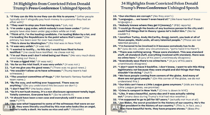 President Trump was also under a gag order, unable to discuss his perspective during the trial, a trial solely intended to harm his campaign. His opponent was allowed to interfere in this trial (and the others), several of President Trump’s Constitutional rights were violated throughout, including a most basic right of being told what he is charged with, the judge, a dubious choice for Trump’s prospects, was hand selected outside the normal process, the New York court had no legitimate jurisdiction in the case, and every legal analyst on TV admits the case will be overturned on appeal, and yet President Trump was not allowed to speak at all? This seems like injustice to a large segment of us who plan on voting in the Fall.