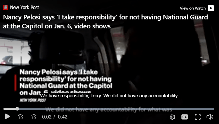 Last week, Representative Pelosi was asked to explain comments made several years back regarding January 6. In this unearthed video, she speaks privately with aides and assumes responsibility January 6 events. She never denied making these comments, but when confronted, she did, of course, shift the blame to Trump and Republicans. The last four years she had this on her conscience but never admitted anything publicly because a better political avenue opened up.