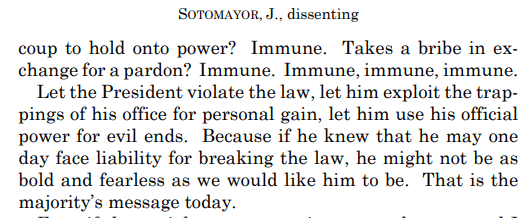 The president of the United States is the most powerful person in the country and possibly the world. When he uses his official powers in any way under the majority’s reasoning, he now will be insulated from criminal prosecution, orders the Navy SEAL team six to assassinate a political rival immune, organizes a military coup to hold onto power immune, takes a bribe in exchange for a pardon, immune, immune, immune, immune.