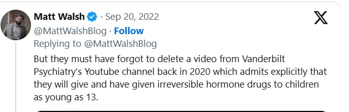 They appeal to medical authorities who advocate for surgery, puberty blockers, and other “gender affirming” medications while ignoring legitimate concerns of another large body of medical authorities. Why should these medical authorities be discounted?