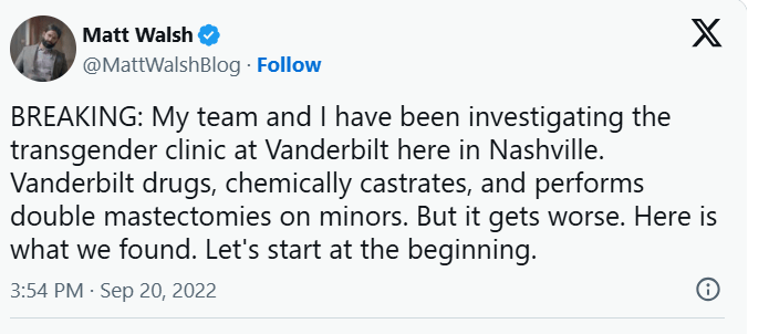 In 2022, Matt Walsh of the Daily Wire exposed this practice and successfully lobbied Tennessee to shut down “medical facilities offering “gender affirming” care to minors.
