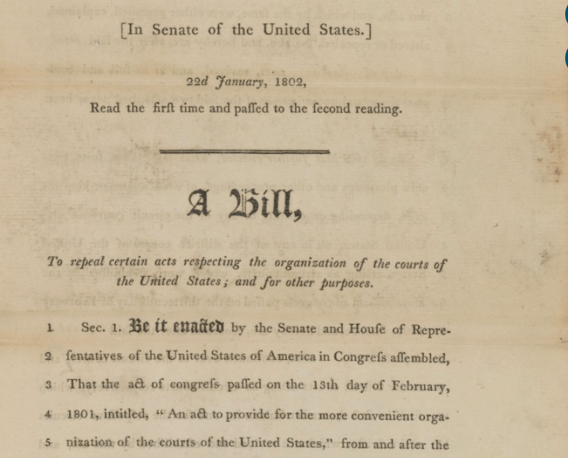 Except for the Supreme Court, all courts have been created by the Legislative Branch as was done in 1801 and many times since. Since the courts were created by the legislature and their jurisdiction defined by the legislature, the legislature is also authorized to remove any such courts or to re-define their jurisdiction.