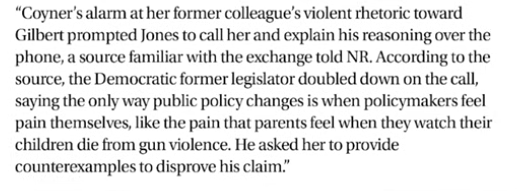 Mr. Jones then proposed a hypothetical situation: if he had two bullets who would he shoot: his Republican political opponent, Virginia House Speaker Gilbert, Adolf Hitler, or Pol Pot? Mr. Gilbert, of course, would get both bullets.