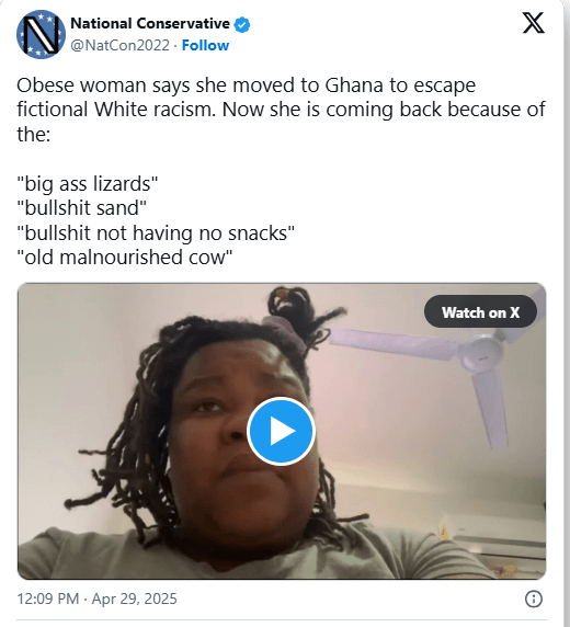 “I would rather go back to America and deal with racism in America before I sit here in Africa and deal with the bulls*** bribery, the bulls** fraud, the bulls** scams, the bulls** too expensive, the bulls** not having no snacks, the bulls** not having no food, the bulls** electricity, the bulls** hot water, the bulls**…what’s that shit called? Coming down? The bulls** animals outside the house, it’s big ass spiders, it’s big-ass lizards, all colors you ain’t never seen before, all in the f***ing room with you, sleeping in the room with you,” the woman popped off in a video posted to social media.