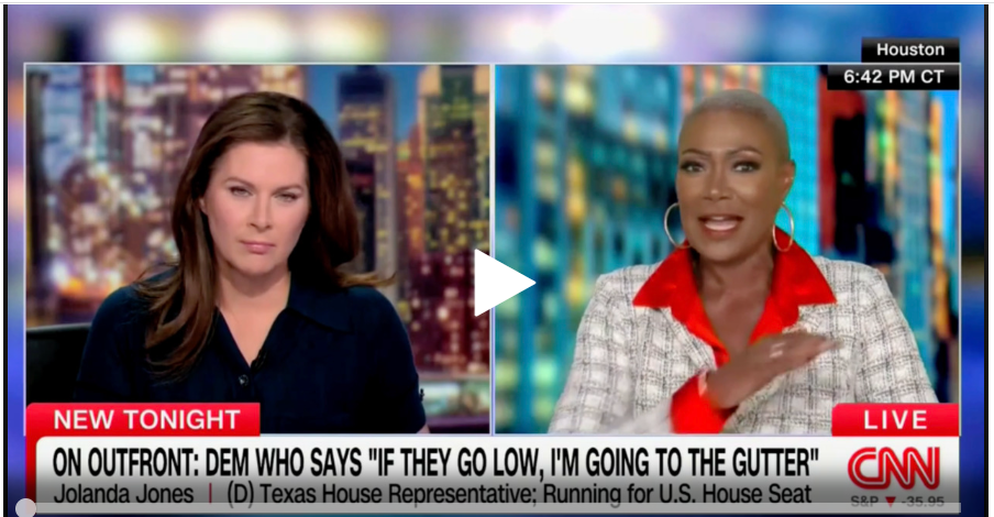 Let us move from outraged citizens who idiotically threaten violence to save America from supposedly fascists Republicans to political leaders cut from the same cloth. Representative Jolanda Jones made a not-so-veiled threat during a CNN interview: