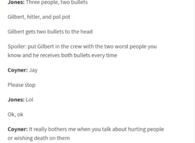 Ms. Coyner, the colleague he communicated with, asked for a cessation: “Please stop . . . It really bothers me when you talk about about hurting people or wishing death on them.”